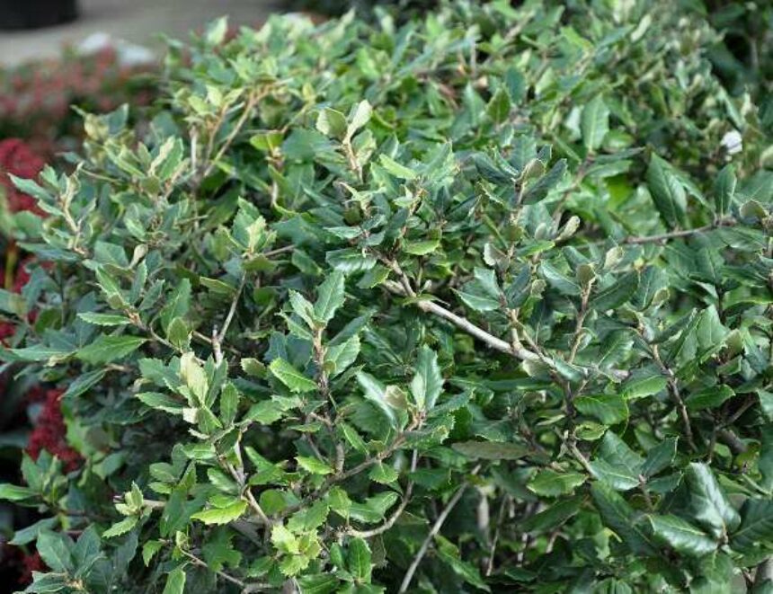 Quercus ilex, steeneik, deze in de mediterrane streken vrij hoog wordende groenblijvende eikenboom blijft in onze regio een bescheiden boom tot max. 8 m hoog en 4 m breed. Deze eikensoort is wintergroen en heeft een mooie rechte stam met een ovaal tot kogelvormige kruin. De bladeren zijn leerachtig, 3 tot 8 cm groot, blinkend groen, hulstachtig getand en viltgrijzig behaard aan de onderkant. De Quercus ilex houdt van kalkrijke niet te natte grond, hij is goed bestand tegen zoute zeewind en luchtvervuiling, laat zich makkelijk snoeien en kan zowel als solitair, kuipplant als voor een haag of straatbeplantingen gebruikt worden.
