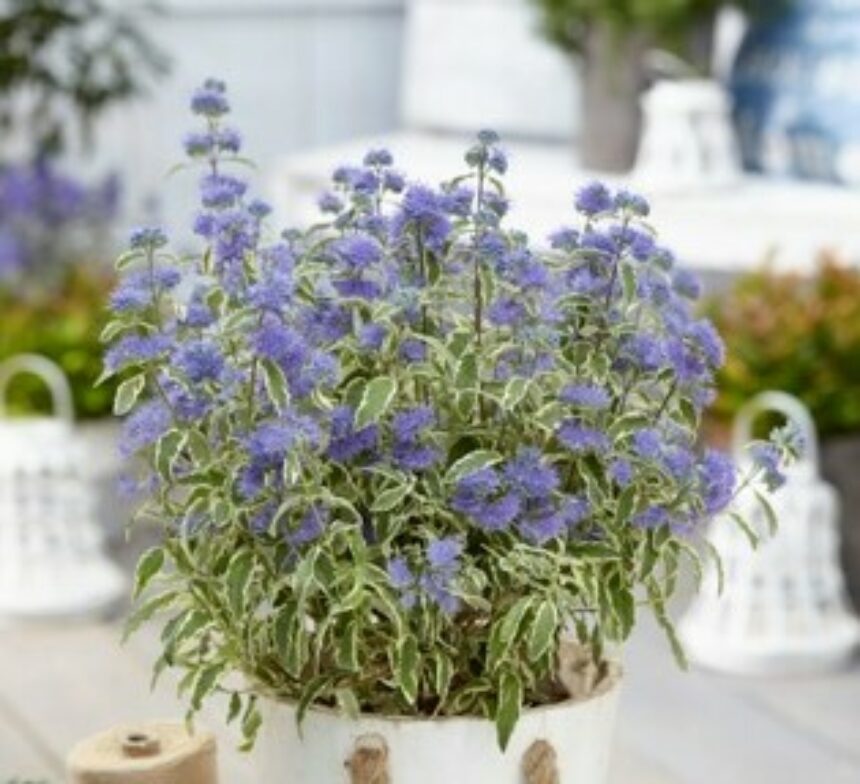 Caryopteris clandonensis 'white surprise' is een klein bladverliezend struikje tot 1 m hoog en breed, met een opgaande vorm en zeer rijkelijk bloeiend met zoet geurende donkerblauwe bloempluimen. Ook de witbonte , lancetvormige bladeren zijn aromatisch en naar munt ruikend als men ze aanraakt of er overwrijft. De afmeting en langdurige bloei van augustus tot oktober maken van deze caryopteris een bijzondere (half)heester voor de gemengde border of de kleine tuin. Ze zijn bovendien ook droogte tolerant en geschikt voor de stedelijke omgeving.